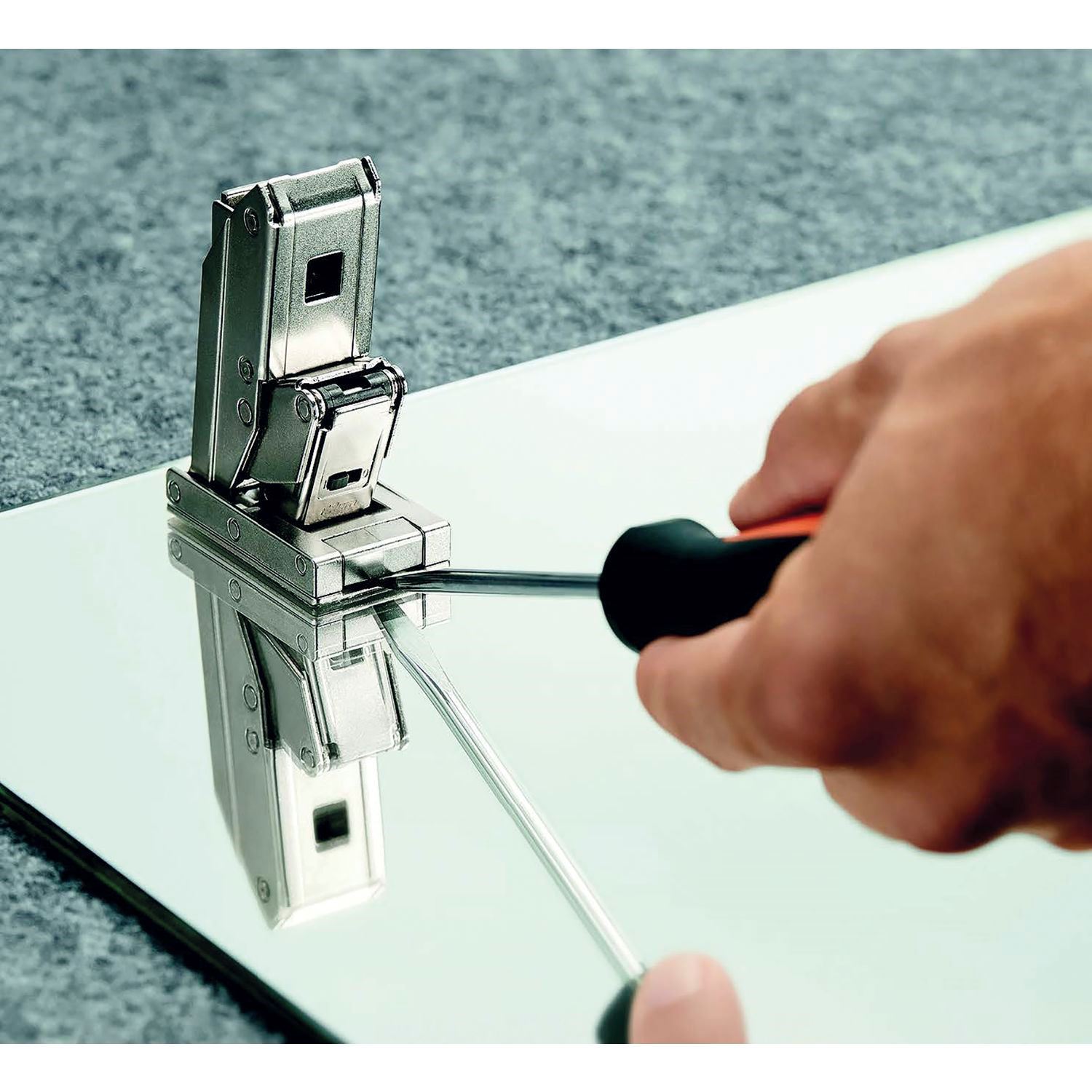 Montažna plošča in plošča posodice se prilepijo na sprednjo stranico, brez vrtanja v steklo.