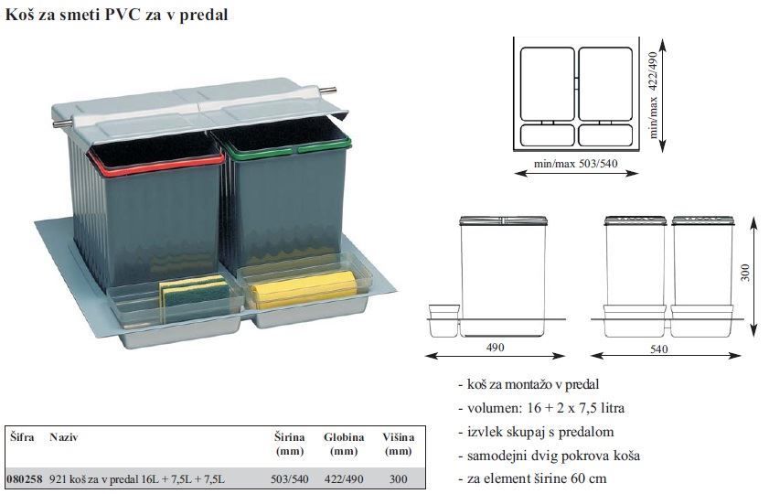 - koš za montažo v predal- volumen: 16 + 2 x 7,5 litra- izvlek skupaj s predalom- samodejni dvig pokrova koša- za element širine 60 cm