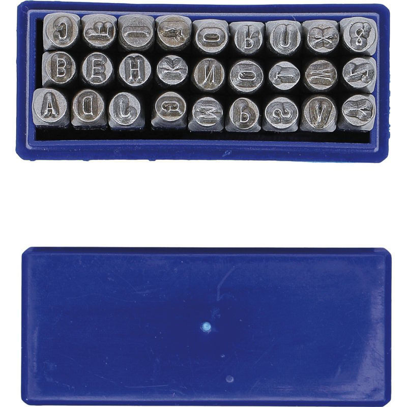Idealni za pribijanje v jeklo in železo po* DIN?1451,* z jasnim in enotnim napisom. Gravura je nameščena na izbočeni površini z omejeno globino. Komplet vsebuje velike črke A–Z in znak „&“. Črke so zložene v kaseti. Izdelano iz orodnega jekla, trdot 46–52 HRC.