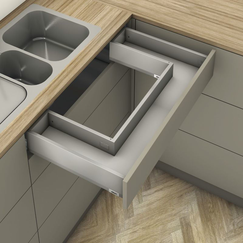 Obseg dobave:1 x garnitura zunanjih stranic s pokrivnimi kapicami1 x garnitura notranjih stranic s pokrivnimi kapicami1 x garnitura vodil predala BLUMOTION S2 x garnitura pritrdilec lesene zadnje stranice
