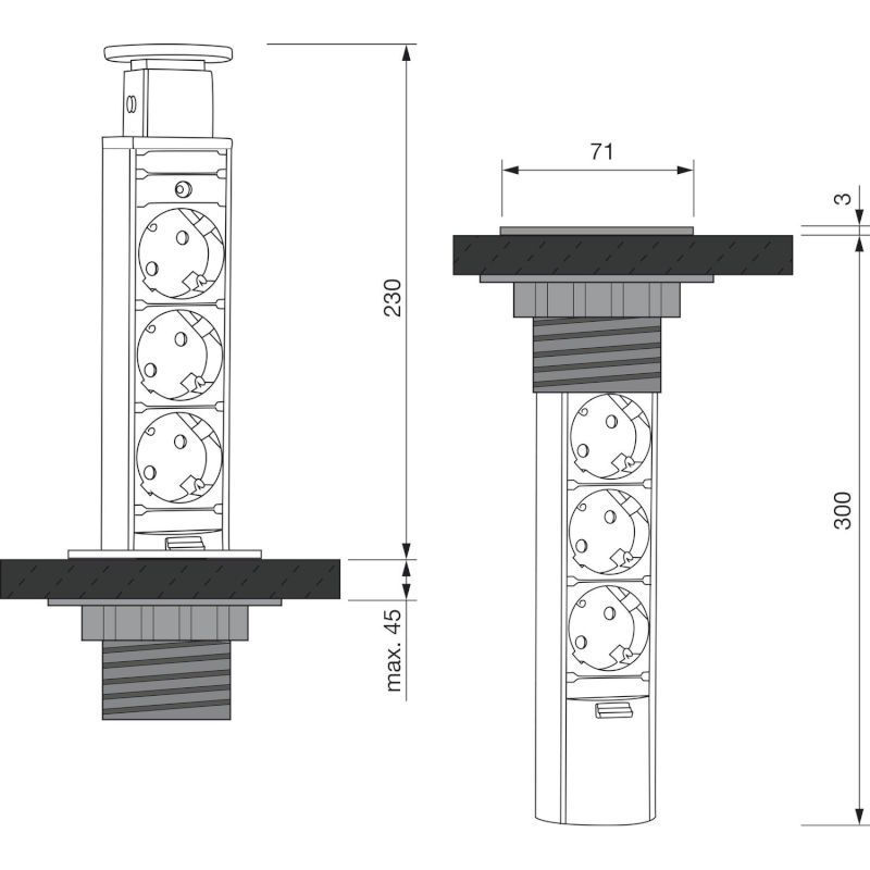 • Oprema: 3 x vtičnic, za 45° nagnjene, z zaščito, priključek s kotnim vtičem