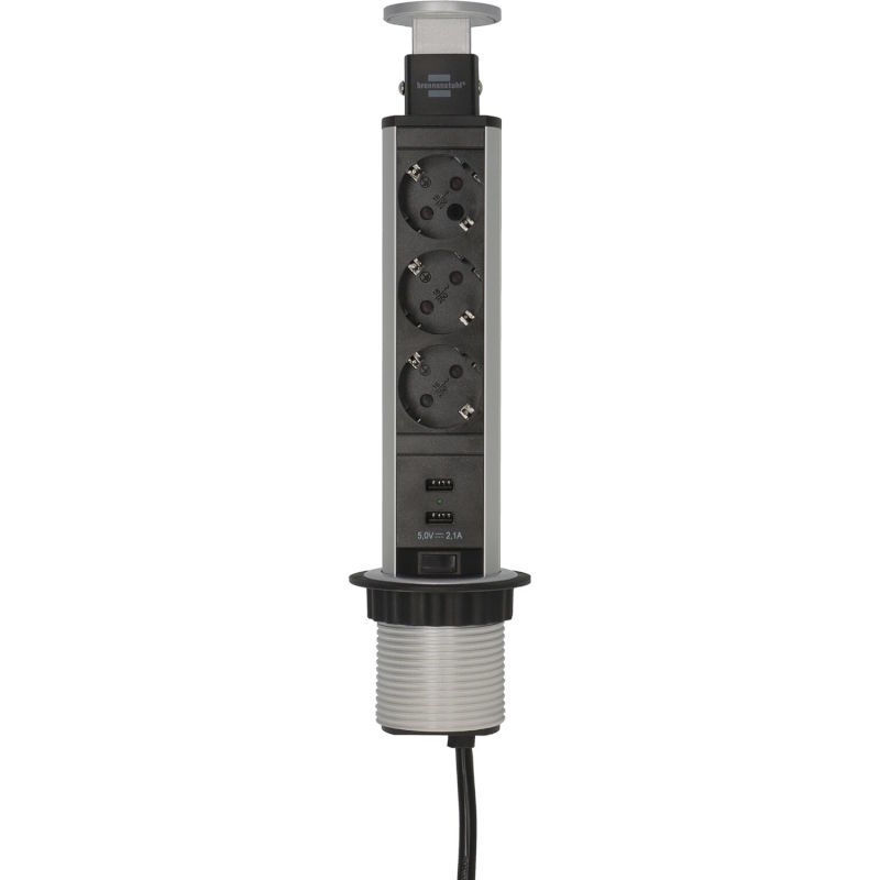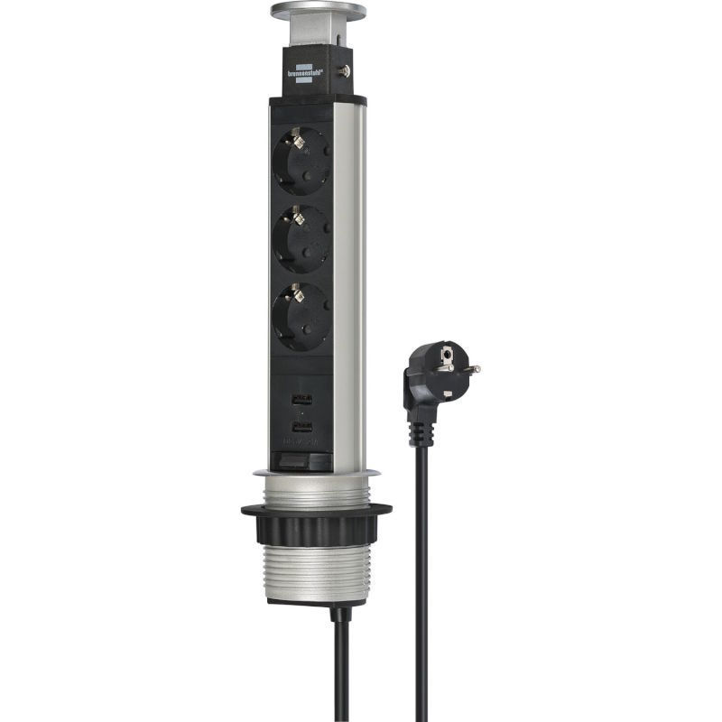 BRENNENSTUHL vtičnica Tower Power, 3 x Schuko, USB-A polnilnik, barva aluminija, Potopna vtičnica za vgradnjo v mize in delovne plošče.