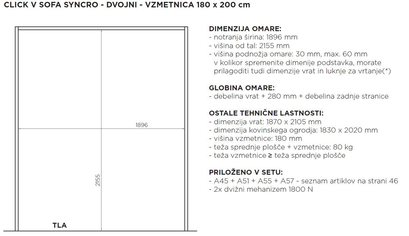 REŠITVE ZA MAJHNA STANOVANJASistem za zložljivo posteljo CLICK-V ali WATT je združljiv tudi s sistemom SOFA SYNCRO, ki združuje 2 izredno pomembna elementa v vsakem stanovanju. To sta sedežna garnitura in postelja.Združitev dveh sistemov za maksimalno izkoriščen prostor.Z združitvijo teh dveh sistemov, lahko kljub pomanjkanju prostora v stanovanju, gledate televizijo iz udobja naslanjača, oziroma se enostavno izognete temu, da bi gostje sedeli na vaši postelji. Da se postelja transformira v sedežno garnituro in nazaj, je potreben le nežen potisk (Sofa sncro) oziroma en sam klik na priloženem daljinskem upravljalniku (Sofa syncro WATT), za vse ostalo poskrbita elektromotor in zložljivi sistem sedežne garniture.Pozabite na naprezanje pri dviganju in spuščanju in se prepustite popolnemu udobju.Na voljo sistem za dvojno posteljo.- dvojna postelja: 180 x 200 cm