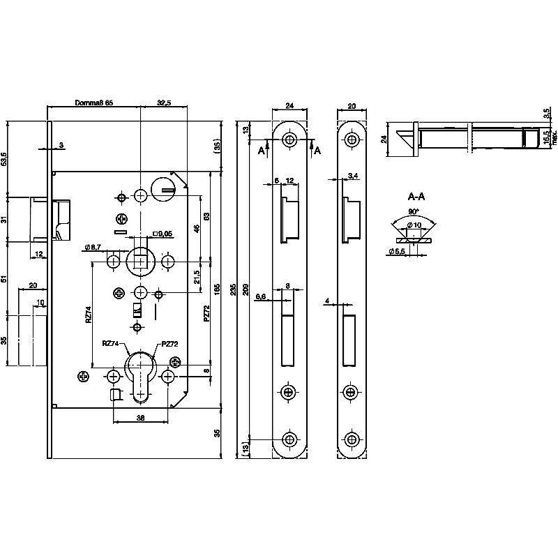 ECO vdolbna ključavnica GBS 81 PZW, leva, trn 65, okrogla čelnica 20 mm, inox.