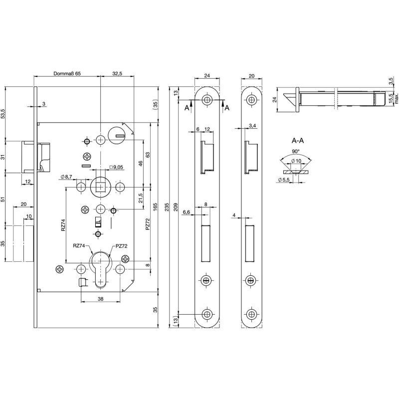 ECO vdolbna ključavnica GBS 81 RZW, leva, trn 65, okrogla čelnica 20 mm, inox.