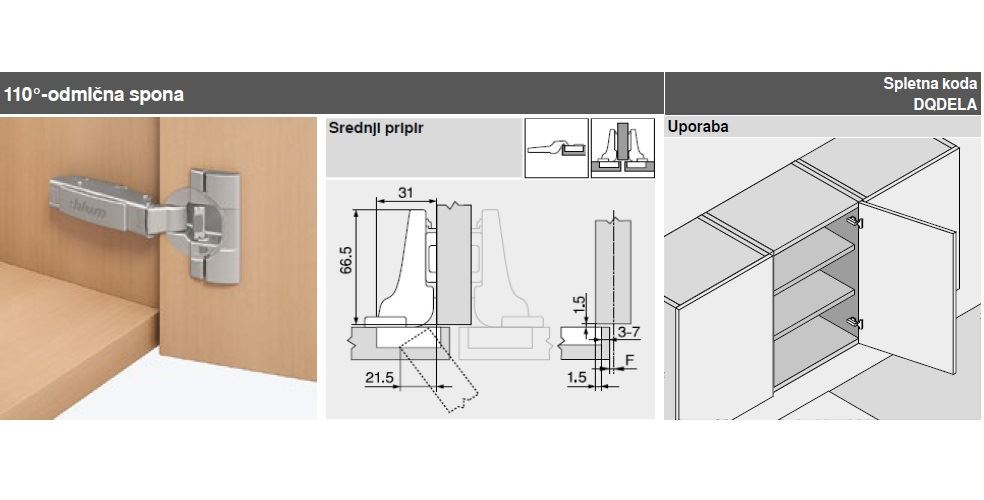 - Z integriranim sistemom BLUMOTION (z deaktiviranjem)- Združljivo z obstoječimi montažnimi ploščicami- Popolnoma kovinska odm. spona, črna- Odpiralni kot 110°- Z udobno nastavitvijo globine prek navojnega polža- Z zapiralno avtomatiko (vzmet)- Montaža in demontaža vrat na korpus brez orodja- Tridimenzionalna nastavitev (z ustrezno montažnoploščo)