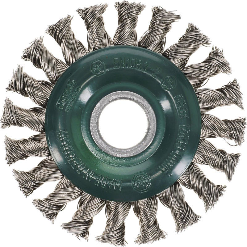 Jeklena prepletena okrogla žičnata krtača industrijske kakovosti za vpetje v vse običajne kotne brusilnike. Dolga