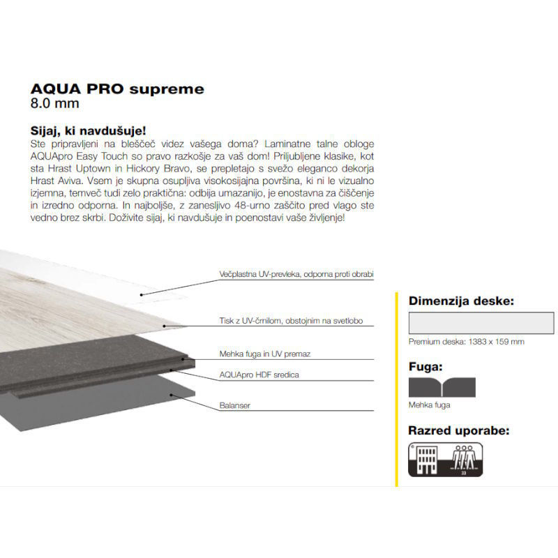 Si želite bleščeče elegance v svojem domu? Laminatne talne obloge AQUApro Easy Touch prinašajo pridih razkošja in sodobnega stila. Brezčasne klasike, kot sta Hrast Uptown in Hickory Bravo, se harmonično dopolnjujejo s svežim in elegantnim dekorjem Hrast Aviva.