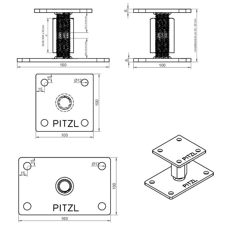 PITZL nosilec stebrov tip 10920.1600, prevlečen z ZiNiP, desni/levi-Levi/desni nosilec stebrov primeren za sprejemanje navpičnih in vodoravnih obremenitev. Zaradi levega/desnega navoja se lahko nosilec preprosto in hitro nastavi.