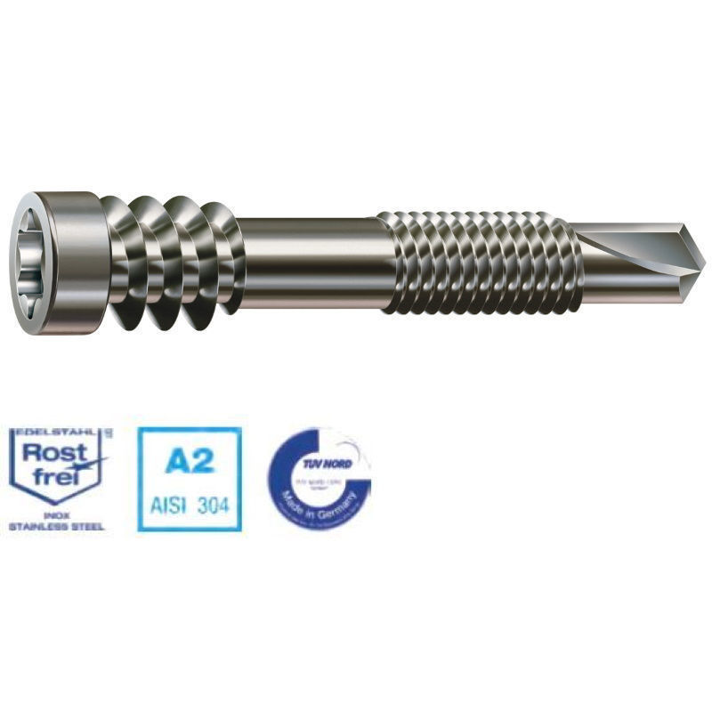 Profilni vijak Spax se uporablja za pritrditev lesenih desk na aluminijaste podkonstrukcije.Fiksirni navoj zmanjšuje škripanje v konstrukciji plošč.Stabilni dvojni navoj za boljši utor in večjo pokritost robov.Konica svedra za aluminijaste profile za debelino sten do 3,0 mm brez predhodnega vrtanja.Možna zelo nizka gradbena višina celotne terasne konstrukcije. Višina možna najmanj 46 mm.Obdelava podatkov:Korak 1: odvisno od lesa, predhodno vrtanje plošče s HSS svedrom premera 5.2 ali 5.5 mm.Korak 2: vijak privijte z nastavkom SPAX-BIT T-STAR plus T25.Rezultat: brezhiben videz, brez spajanja in brez upogibanja lesa. Priviti vijak lahko ponovno odvijemo, ne da pri tem poškodujemo glavo vijaka.Prednosti izdelka: