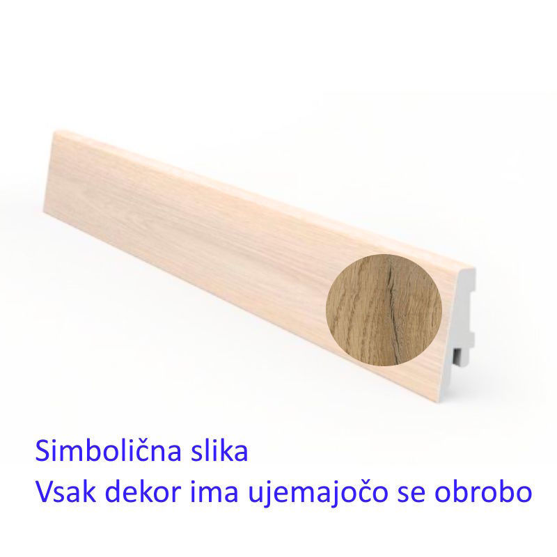 - Ta moderna, 58 mm visoka, vlagoodporna PVC letev v ravni obliki popolnoma prekrije raztezanje med tlemi in steno.
