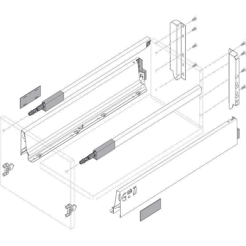 Obseg dobave:1x gt. nosilnih stranic in pokrivnih kapic1x gt. vodila za korpus za TIP-ON BLUMOTION1x gt. držala lesenega hrbtišča