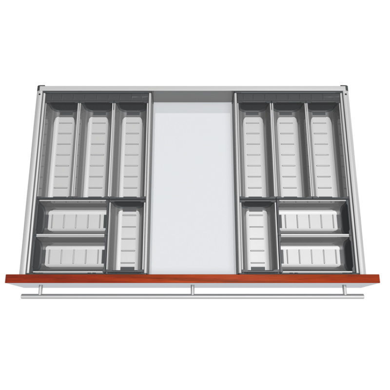 • Predelki in vzdolžni delilniki iz visoko kakovostnega legiranega jekla v kombinaciji z vzdržljivimi deli iz umetne mase,peščeno sive barve (RAL 7037)