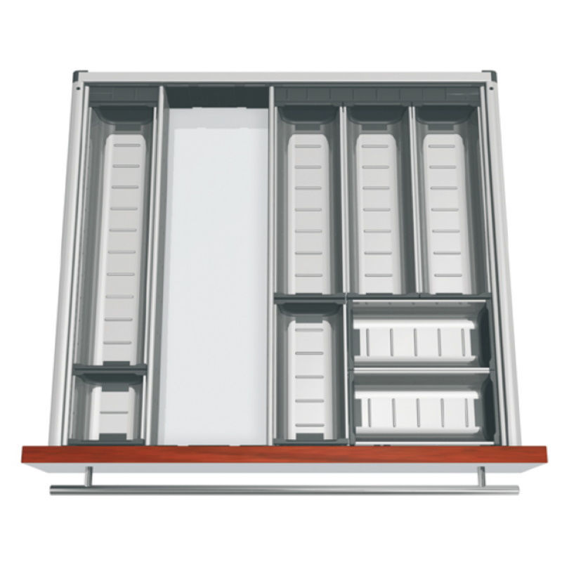 • Predelki in vzdolžni delilniki iz visoko kakovostnega legiranega jekla v kombinaciji z vzdržljivimi deli iz umetne mase,peščeno sive barve (RAL 7037)