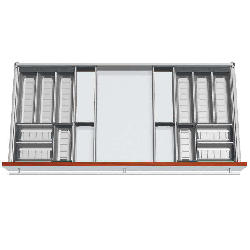 • Predelki in vzdolžni delilniki iz visoko kakovostnega legiranega jekla v kombinaciji z vzdržljivimi deli iz umetne mase,peščeno sive barve (RAL 7037)