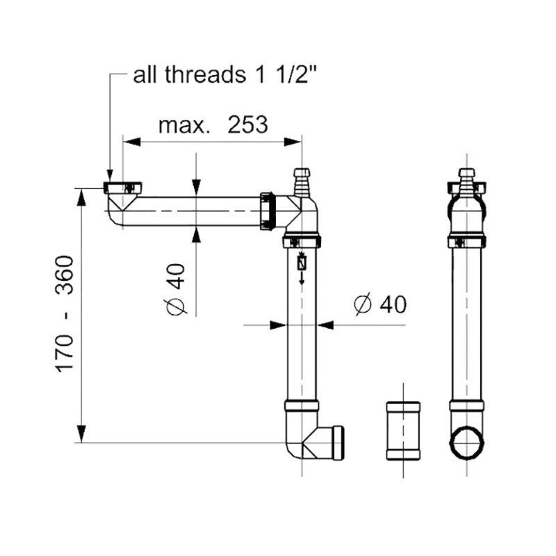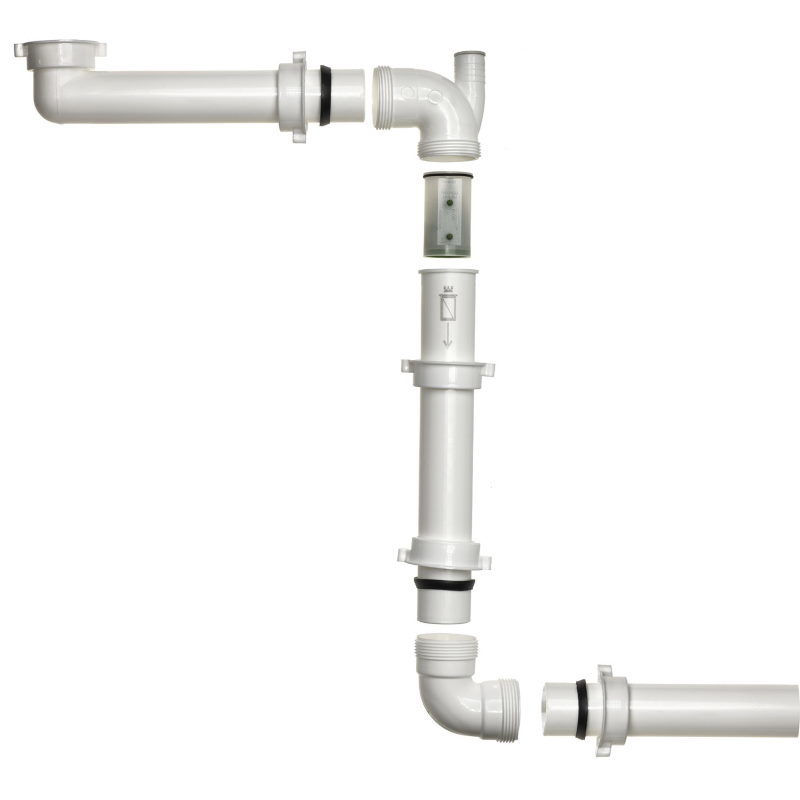 Pomembne prednosti: prihranek na prostoru in s tem tudi več prostora pod koritom.Brez neprijetnih vonjav iz kanalizacije.Zaradi samo 3 kolen (namesto 5ih) obstaja manjša nevarnost puščanja.Hitra in lahka montaža.Primeren za skoraj vse nova in že vgrajena pomivalna korita.Odtočna cev s priključnim iztokom za pralni ali pomivalni stroj.