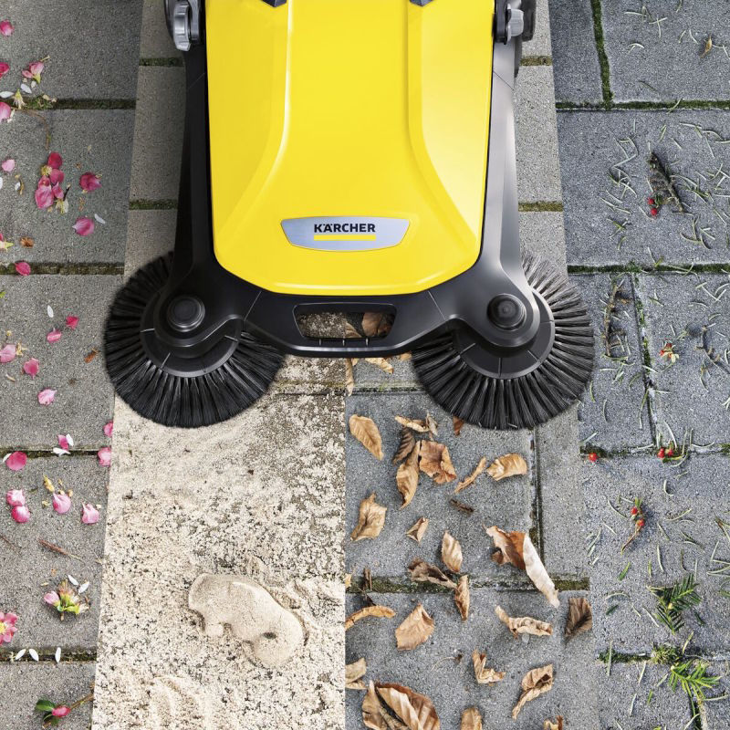 Naj bodo to odpadni cvetovi pomladi, pesek poleti, listje jeseni ali material za posipanje cest pozimi, učinkovit in ergonomičen pometač S4 Twin poskrbi za celoletno pometanje okoli hiše in vrta. Močan valj z 2 širokima krtačama z celotno širino 680 milimetrov brez problema pometa površine do 2400 m² na uro. Direktno pometanje v 20 litrsko zbiralno posodo. Dolge ščetine na stranskih krtačah poskrbijo za temeljito čiščenje tudi ob robovih. Brezstopenjsko višinsko nastavljiv ročaj se optimalno prilagodi višini uporabnika. Zaradi bajonetne ključavnice na ročaju je prilagoditev želene višine čisto preprosto. Pometalec lahko po potrebi, brez da bi vam se potrebno sklanjati, zložite in s tem tako privarčujete na prostoru. Krtače lahko preprosto zamenjate brez dodatnega orodja. Zbiralna posoda za umazanijo se preprosto sname in se brez kontakta varno sprazni.